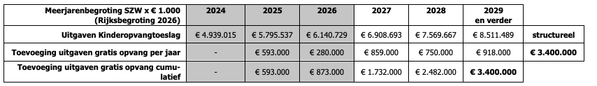 De extra kosten van het huidige kinderopvangplan bedragen structureel jaarlijks € 3,4 mld. Vanaf 2025 tot en met 2029 wordt dat stapsgewijs toegevoegd aan de begroting. Op pagina 100 en 101 van het concept wetsvoorstel staat de verdeling van de ingeboekte extra uitgaven aan de kinderopvangtoeslag van € 3,4 mld. voor het wetsvoorstel over de komende jaren in de huidige begroting:
