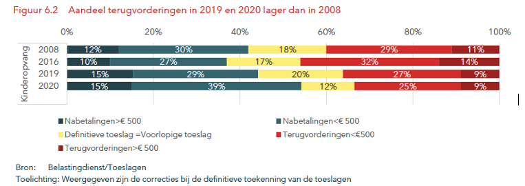 Maar liefst een kwart (2020: 25%) van alle beschikkingen levert een terugvordering op van minder dan € 500. Het ophogen van de doelmatigheidsgrens naar € 500 voor de kinderopvangtoeslag – bijvoorbeeld als stap 1 in 2026 - levert dan al meer dan 100.000 terugvorderingen per jaar minder op. En een besparing van zoveel terugvorderingen jaar levert niet alleen minder last voor ouders op, maar ook een forse besparing op het ambtenarenapparaat dat zich hier nu mee bezig houdt.