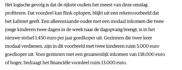 Voor huishoudens tot een modaal inkomen is er geen enkele lastenverlichting, voor huishoudens met anderhalf modaal is er een beperkt netto-voordeel maar naarmate het inkomen stijgt neemt het extra netto belastingvoordeel stevig toe tot meer dan € 10.000 netto per jaar. Ongeveer 80% van de kinderopvangtoeslag gebruikers heeft een verzamelinkomen van anderhalf keer modaal (ca. € 70.000) of hoger en ongeveer 25% heeft een inkomen van drie keer modaal (ca. € 140.000) of hoger (SZW, 2025). Huishoudens met een laag inkomen gaan er niets op vooruit. Zij ondervinden slechts nadeel door het feit dat de € 3,4 miljard aan extra uitgaven voor dit wetsvoorstel gedekt worden met het afschaffen van de Inkomensafhankelijke Combinatiekorting (IACK). Dat netto lastennadeel is geen risico maar een zekerheid en kan de komende jaren oplopen tot bijna € 3.000 en treft werkende ouders met lage inkomens het zwaarst in de portemonnee.